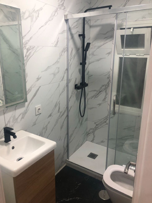 Reforma integral de baño en un departamento. Cambio e instalación de un nuevo inodoro, canilla, ducha y espejo. Se realizó un revestimiento a las paredes del baño.
