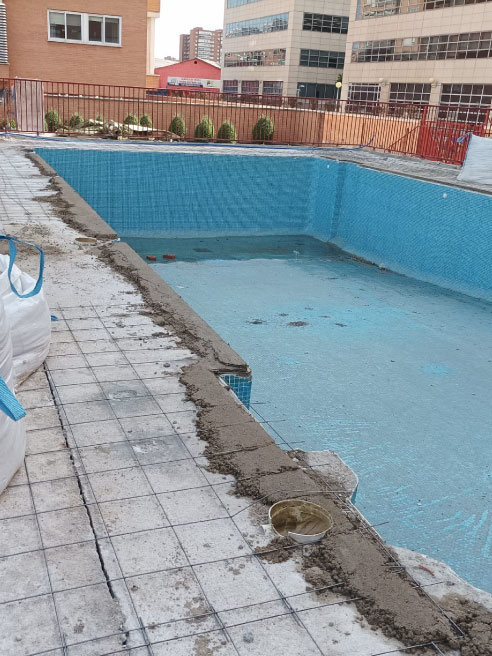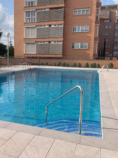 Revestimiento de la piscina con teselas. Creación de espacios comunes. Transformación total y moderna.