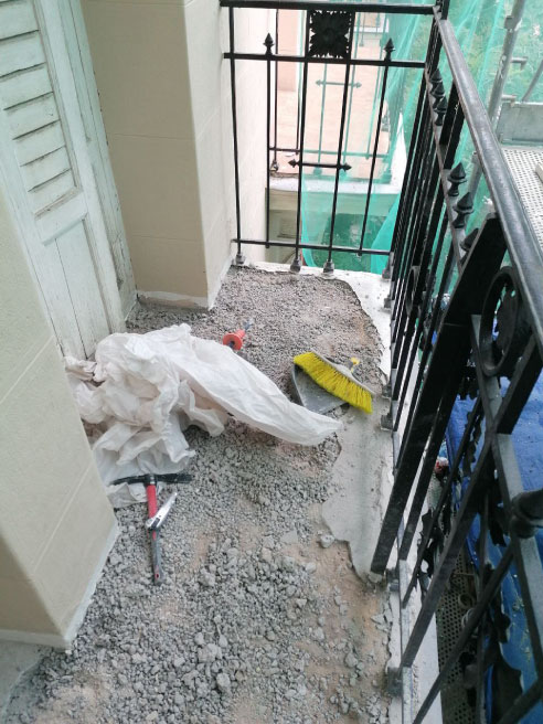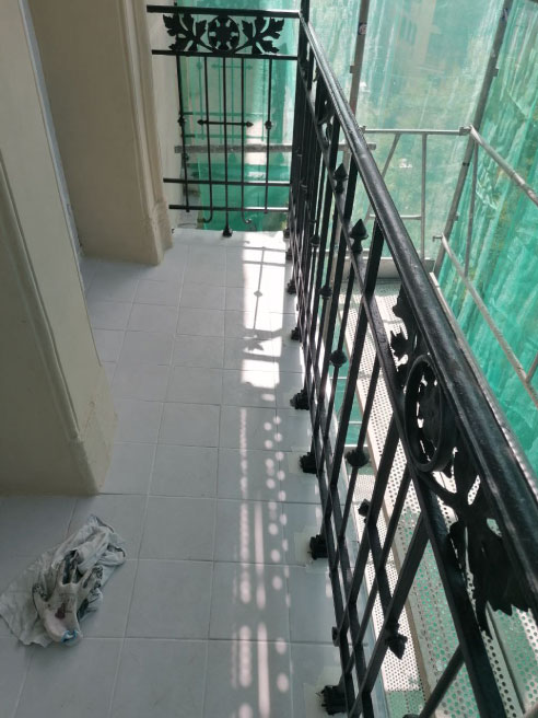 Reparaciones de cornisas, molduras en chapas de zing, levantado de suelos en balcones y colocados con solera nueva. Repintado de cerrajería y paredes.