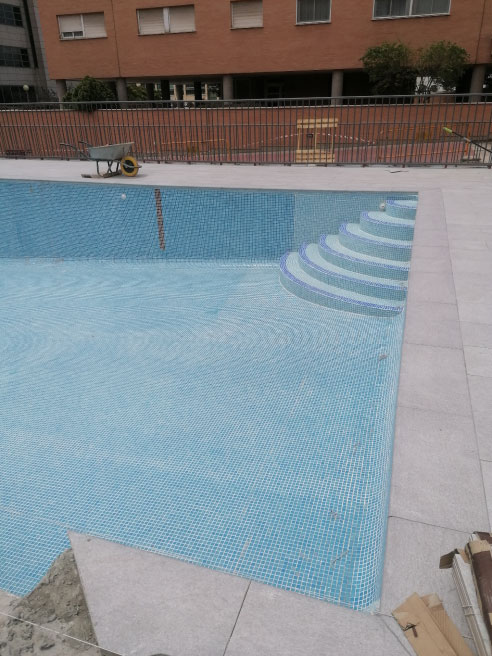 Revestimiento de la piscina con teselas. Creación de espacios comunes. Transformación total y moderna.