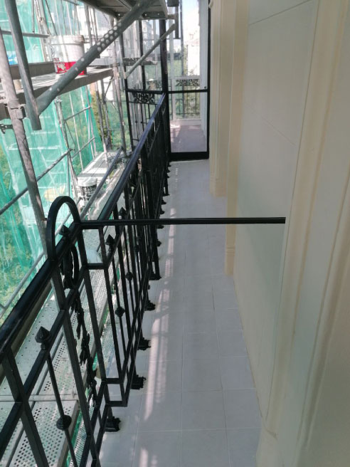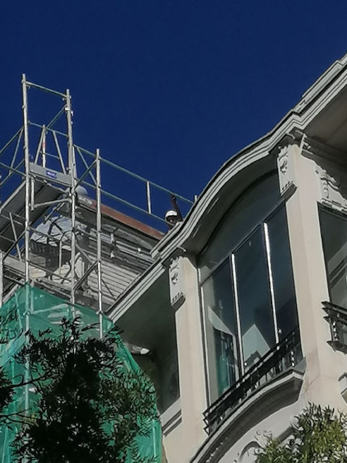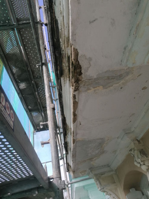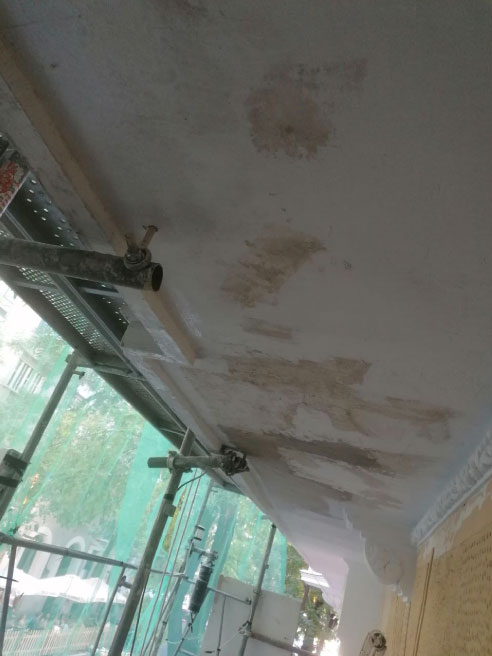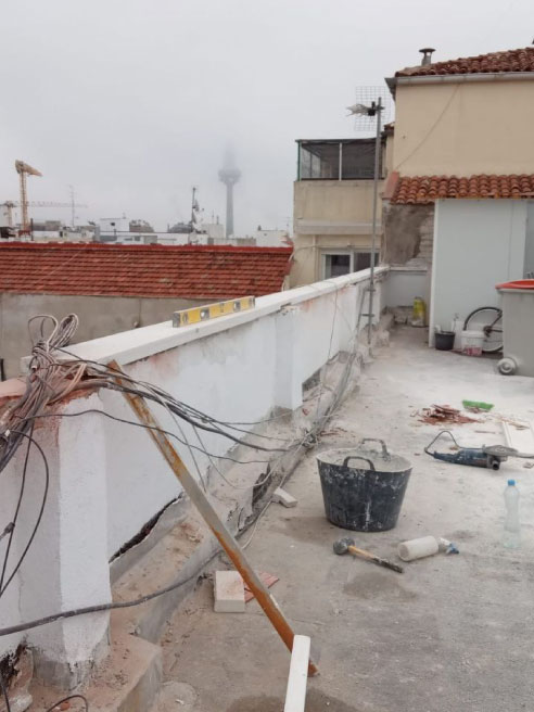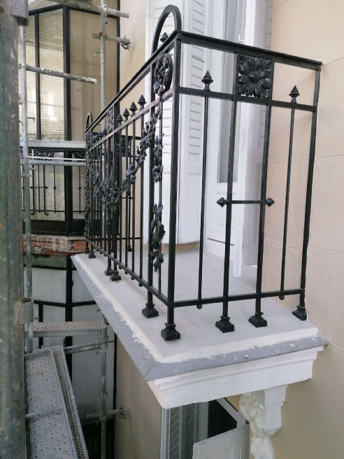 Reparaciones de cornisas, molduras en chapas de zing, levantado de suelos en balcones y colocados con solera nueva. Repintado de cerrajería y paredes.