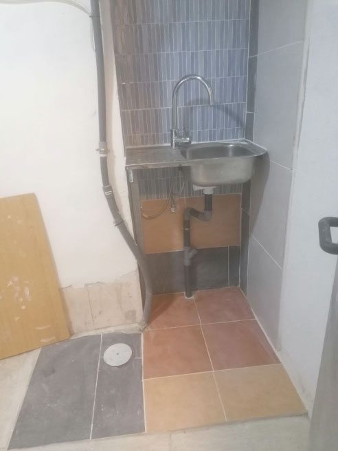 Reforma integral de la cocina con demolición de los viejos azulejos. Revestimiento de paredes con plaquetas de autoadhesivo 100% resistente al agua.